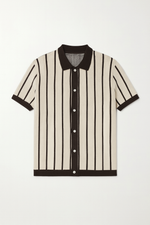 Cream body with bold dark brown vertical stripes, contrast collar and trims, breathable knit